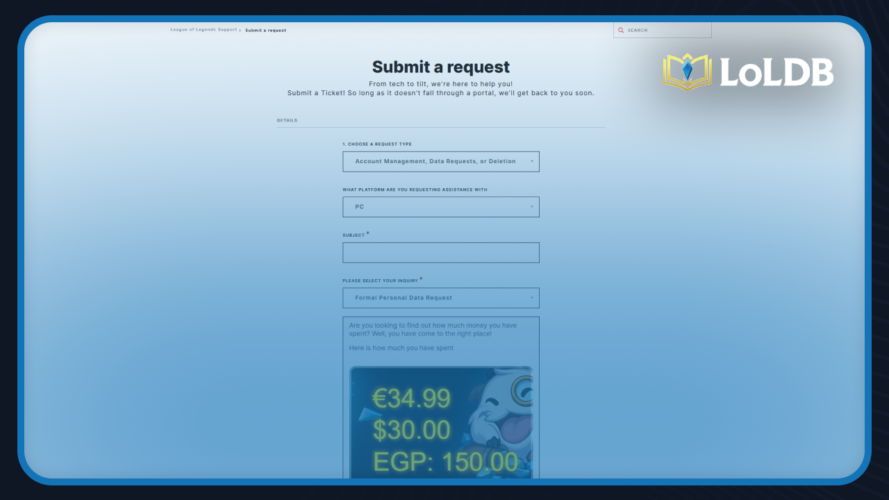 Riot Games doesn't provide spending information directly within the League of Legends client. The only way to view your total account spending is through the official support page using Riot's data request system